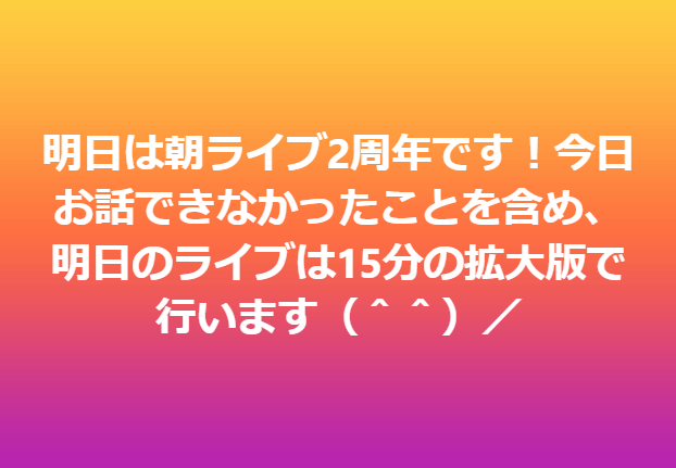 明日は朝ライブ2周年です!今日お話できなかったことを含め、明日のライブは15分の拡大版で行います(^^)/