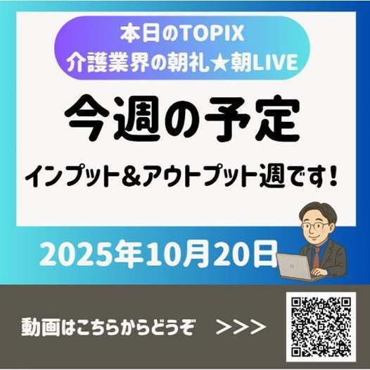 概要: この動画は、介護業界の朝礼ライブ配信として、今週の予定を共有しながら、インプットとアウトプットをバランスよく取り入れる重要性について語られています。視聴者との交流を交えつつ、今後のイベントやセミナーについても紹介されています。