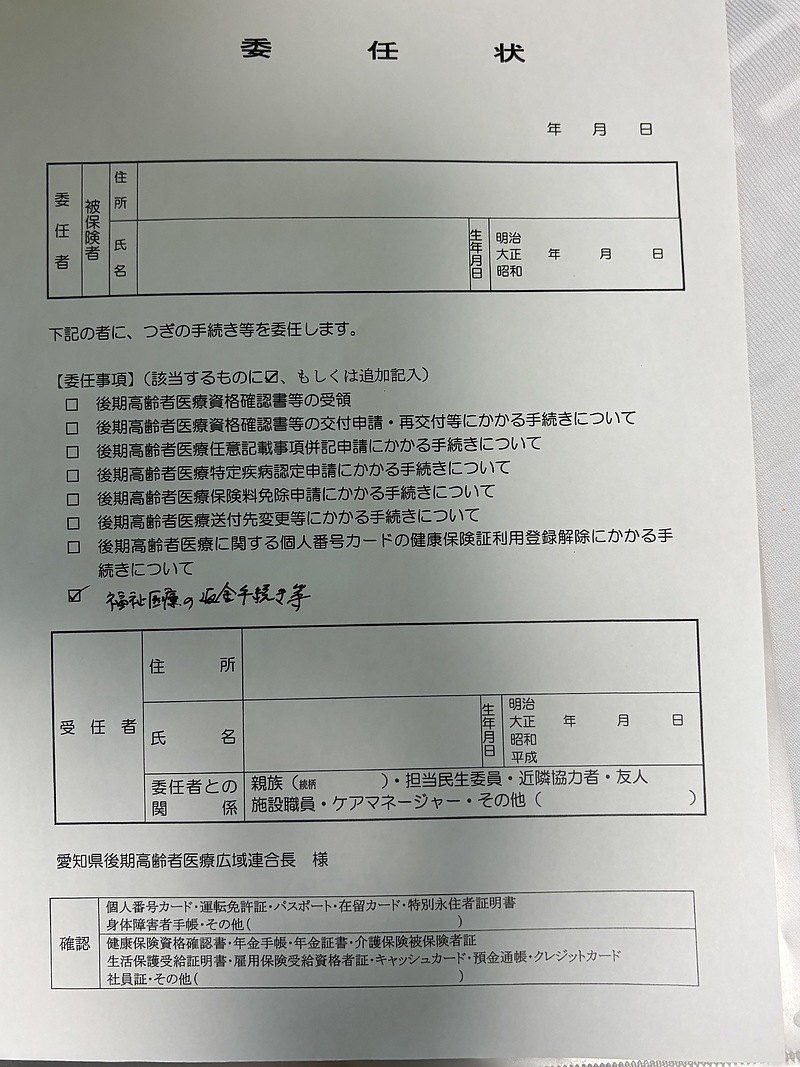 ミモシー契約者の方が身体障害者手帳を取得できた為、本人の代理人として市役所に出向きました。身体障害者手帳を受け取り、福祉課から保険年金課へ向かいます。医療費控除が受けられるように、後期高齢者医療保険に変更手続きを行います。途中、ご本人に電話もして、国民健康保険から後期高齢者医療保険に変更する事も了承いただきました。窓口の方は親切に、本人の月額負担金が軽減する事を調べてくれ、迅速に対応して頂きました。委任状が必要という事なので、書類を書き進めます。ふと、受任者の項目を見ると…