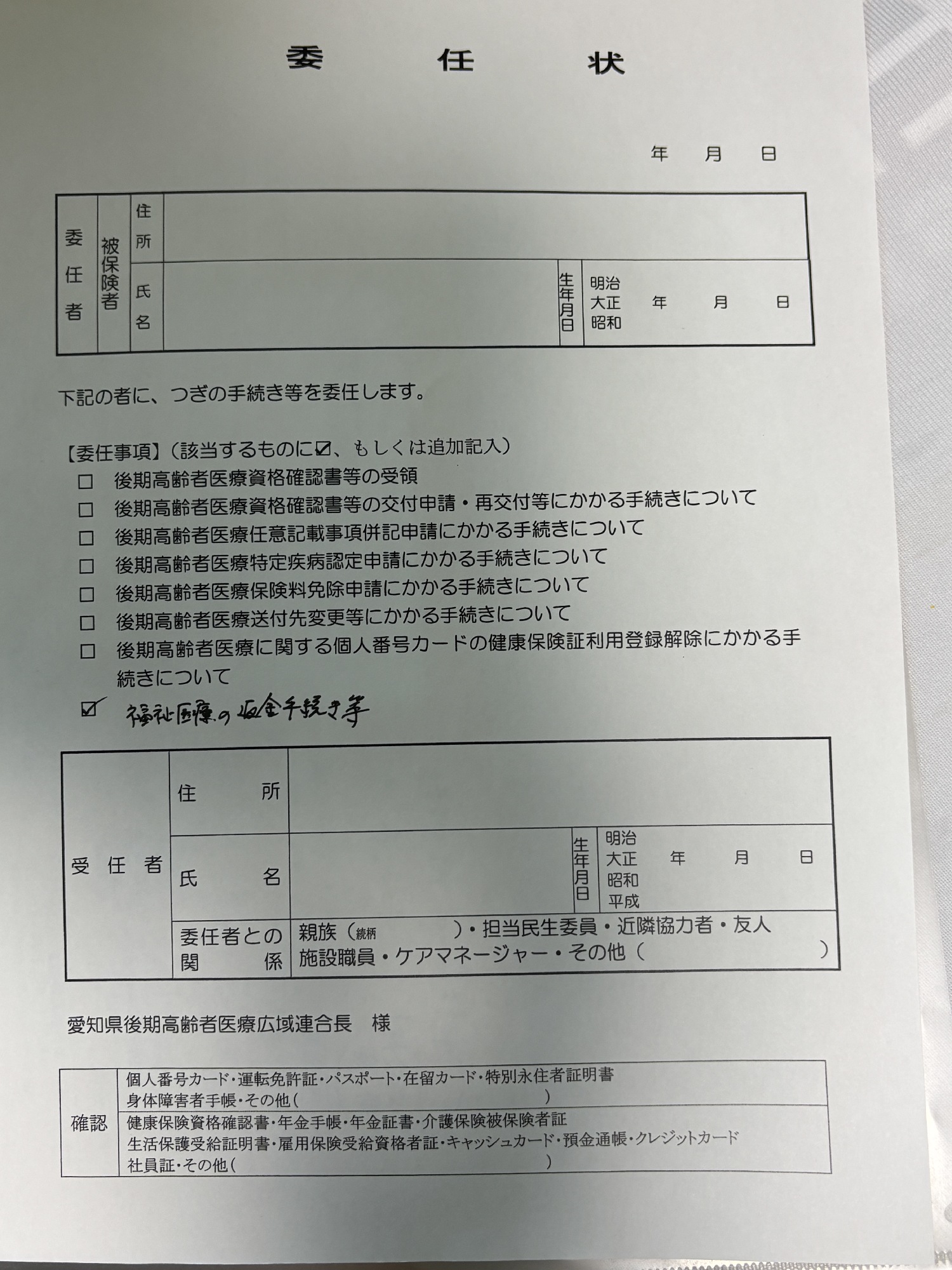 ミモシー契約者の方が身体障害者手帳を取得できた為、本人の代理人として市役所に出向きました。身体障害者手帳を受け取り、福祉課から保険年金課へ向かいます。医療費控除が受けられるように、後期高齢者医療保険に変更手続きを行います。途中、ご本人に電話もして、国民健康保険から後期高齢者医療保険に変更する事も了承いただきました。窓口の方は親切に、本人の月額負担金が軽減する事を調べてくれ、迅速に対応して頂きました。委任状が必要という事なので、書類を書き進めます。ふと、受任者の項目を見ると…