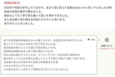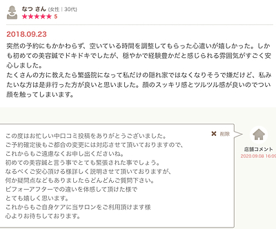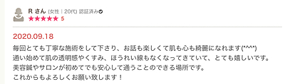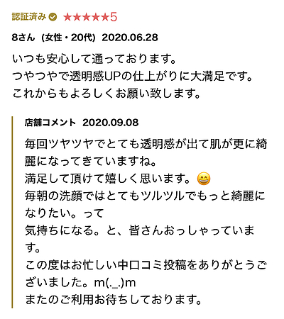 とても親切で、びっくりするくらい肌のトーンがアップしました!大満足だったのでまたリピートしたいと思いました!