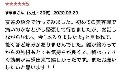 友達の紹介で行ってみました。初めての美容鍼で痛いのかなと少し緊張して行きましたが、お話しながら「はい、今1本入りましたよ」と言われて、驚くほど痛みがありませんでした。鍼が終わってからの施術もとても気持ちが良くて、終わってすぐ効果が実感出来て嬉しかったです。またお願いしたいと思います。