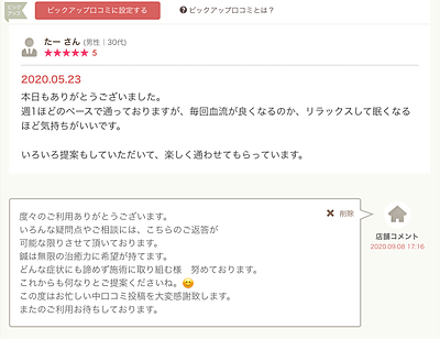 週1ほどのペースで通っておりますが、毎回血流が良くなるのか、リラックスして眠くなるほど気持ちがいいです。