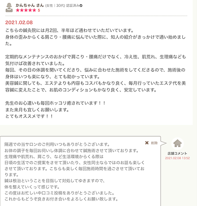 毎回、その日の体調を聞いてくださり、悩みに合わせた施術をしてくださるので、施術後の身体はいつも楽になり、とても助かっています。
