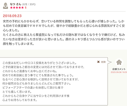 2018.09.23 突然の予約にもかかわらず、空いている時間を調整してもらった心遣いが嬉しかった。しかも初めての美容鍼でドキドキでしたが、穏やかで経験豊かだと感じられる雰囲気がすごく安心しました。たくさんの方に教えたら繁盛院になって私だけの隠れ家ではなくなりそうで嫌だけど、私みたいな方は是非行った方が良いと思いました。顔のスッキリ感とツルツル感が良いのでつい顔を触ってしまいます。店舗コメント2020.09.08 16:09この度はお忙しい中口コミ投稿をありがとうございました。ご予約確定後もご都合の変更には対応させて頂いておりますので、これからもご遠慮なくお申し出くださいね。初めての美容鍼と言う事でとても緊張された事でしょう。なるべくご安心頂ける様詳しく説明させて頂いておりますが、何か疑問点などもありましたらどんどんご質問下さい。ビフォーアフターでの違いを体感して頂けた様でとても嬉しく思います。これからもご自身ケアに当サロンをご利用頂けます様心よりお待ちしております。