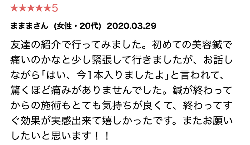 友達の紹介で行ってみました。初めての美容鍼で痛いのかなと少し緊張して行きましたが、お話しながら「はい、今1本入りましたよ」と言われて、驚くほど痛みがありませんでした。鍼が終わってからの施術もとても気持ちが良くて、終わってすぐ効果が実感出来て嬉しかったです。またお願いしたいと思います。