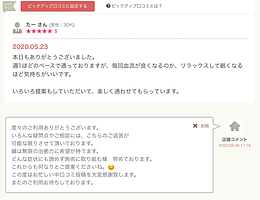 たー さん (男性|30代)星 52020.05.23 本日もありがとうございました。週1ほどのペースで通っておりますが、毎回血流が良くなるのか、リラックスして眠くなるほど気持ちがいいです。いろいろ提案もしていただいて、楽しく通わせてもらっています。店舗コメント2020.09.08 17:16度々のご利用ありがとうございます。いろんな疑問点やご相談には、こちらのご返答が可能な限りさせて頂いております。鍼は無限の治癒力に希望が持てます。どんな症状にも諦めず施術に取り組む様 努めております。これからも何なりとご提案くださいね。この度はお忙しい中口コミ投稿を大変感謝致します。またのご利用お待ちしております。