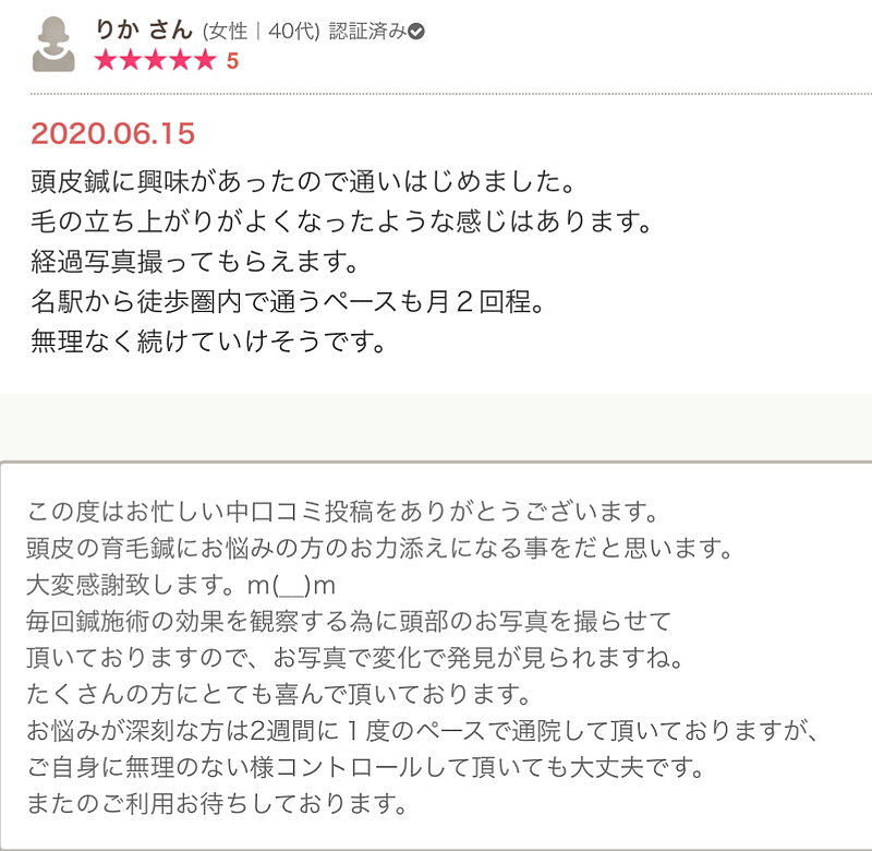 りか さん (女性|40代) 認証済み星52020.06.15 頭皮鍼に興味があったので通いはじめました。毛の立ち上がりがよくなったような感じはあります。経過写真撮ってもらえます。名駅から徒歩圏内で通うペースも月2回程。無理なく続けていけそうです。店舗コメント2020.09.08 17:22この度はお忙しい中口コミ投稿をありがとうございます。頭皮の育毛鍼にお悩みの方のお力添えになる事をだと思います。大変感謝致します。m(__)m毎回鍼施術の効果を観察する為に頭部のお写真を撮らせて頂いておりますので、お写真で変化で発見が見られますね。たくさんの方にとても喜んで頂いております。お悩みが深刻な方は2週間に1度のペースで通院して頂いておりますが、ご自身に無理のない様コントロールして頂いても大丈夫です。またのご利用お待ちしております。