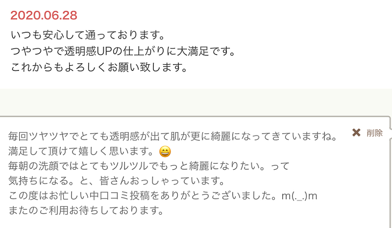 8 さん (女性|20代) 認証済み星 52020.06.28 いつも安心して通っております。つやつやで透明感UPの仕上がりに大満足です。これからもよろしくお願い致します。店舗コメント2020.09.08 17:39毎回ツヤツヤでとても透明感が出て肌が更に綺麗になってきていますね。満足して頂けて嬉しく思います。毎朝の洗顔ではとてもツルツルでもっと綺麗になりたい。って気持ちになる。と、皆さんおっしゃっています。この度はお忙しい中口コミ投稿をありがとうございました。m(._.)mまたのご利用お待ちしております。