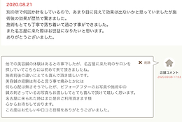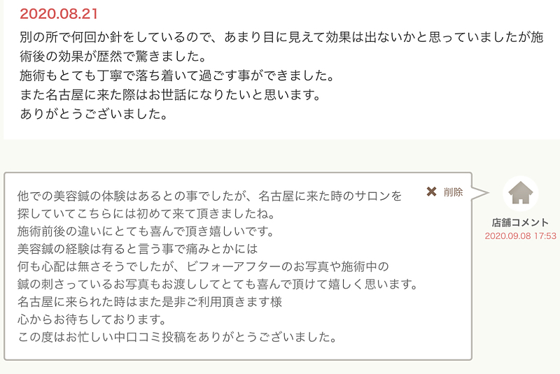 ゲスト さん (女性|20代)星52020.08.21 別の所で何回か針をしているので、あまり目に見えて効果は出ないかと思っていましたが施術後の効果が歴然で驚きました。施術もとても丁寧で落ち着いて過ごす事ができました。また名古屋に来た際はお世話になりたいと思います。ありがとうございました。店舗コメント2020.09.08 17:53他での美容鍼の体験はあるとの事でしたが、名古屋に来た時のサロンを探していてこちらには初めて来て頂きましたね。施術前後の違いにとても喜んで頂き嬉しいです。美容鍼の経験は有ると言う事で痛みとかには何も心配は無さそうでしたが、ビフォーアフターのお写真や施術中の鍼の刺さっているお写真もお渡ししてとても喜んで頂けて嬉しく思います。名古屋に来られた時はまた是非ご利用頂きますゲスト様心からお待ちしております。この度はお忙しい中口コミ投稿をありがとうございました。