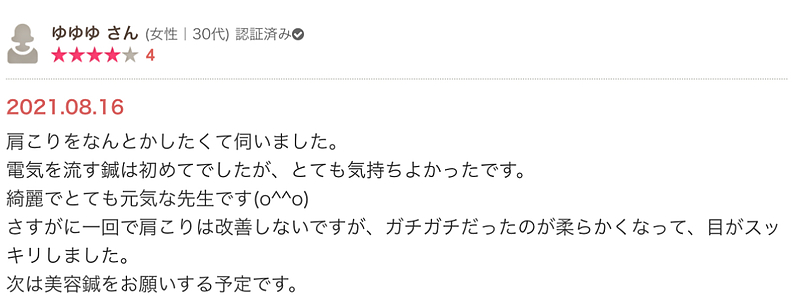 ゆゆゆ さん (女性|30代) 認証済み42021.08.16 肩こりをなんとかしたくて伺いました。電気を流す鍼は初めてでしたが、とても気持ちよかったです。綺麗でとても元気な先生です(o^^o)さすがに一回で肩こりは改善しないですが、ガチガチだったのが柔らかくなって、目がスッキリしました。次は美容鍼をお願いする予定です。店舗コメント2021.08.16 11:20この度は電気の鍼が初めてとの事でしたが、肩こり、眼精疲労が少し改善されて良かったです。美容鍼も興味が有るとの事で次回は美容鍼で喜んで頂ける事楽しみしております。私は 元気がとりえで 風邪等は、この10年ほど記憶に無い程でございます。体調を整える為に少し疲れた感じの際はセルフ鍼をしております。ゆゆゆ様も今後の体調改善の為に是非鍼をご活用頂ければ幸いです。この度はお忙しい中レビュー投稿をありがとうございました。m(_ _)mまたのご予約お待ちしております。(^^)