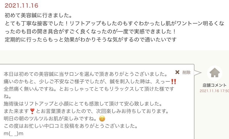 初めて美容鍼に行きました。とても丁寧な接客でした!リフトアップもしたのもすぐわかったし肌がワントーン明るくなったのも目の開き具合がすごく良くなったのが一度で実感できました!定期的に行ったらもっと効果がわかりそうな気がするので通いたいです店舗コメント2021.11.16 17:50本日は初めての美容鍼に当サロンを選んで頂きありがとうございました。痛いのかもと、少しご不安なご様子でしたが、鍼を刺入した時は、えっー! 全然痛く無いんですね。とおっしゃってとてもリラックスして頂けた様ですね。施術後はリフトアップと小顔にとても感激して頂けて安心致しました。また来ます!とお言葉頂きましたので、次回楽しみお待ちしております。明日の朝のツルツルお肌が楽しみですね。この度はお忙しい中口コミ投稿をありがとうございました。