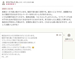 星 52021.12.16 美顔コースで通い続けています。個室で落ち着く空間です。細かいことですが、高層階ではなく階段で行けるのでエレベーターを待つストレスがありません。いつも笑顔で迎えてくださり、施術は快適、うとうとしてしまうことも。リフトアップと目の下のたるみが目立たなくなるのはすぐにわかります。来て良かったと満足して帰ります。毎回次の予約をして帰るので、定期的に通えています。これからも通い続けますので、よろしくお願いしますね!店舗コメント2021.12.16 21:59毎回当サロンのご利用ありがとうございます。個室で落ち着いて頂き施術中はうとうと出来る程リラックスして頂けて安心致します。ご家庭やお仕事の事など日頃の疲れを解消してごゆっくりしたひと時でお顔もリセットされてとても嬉しいです。またのご利用楽しみお待ちしております。この度はお忙しい中口コミ投稿をありがとうございました。m(_ _)m