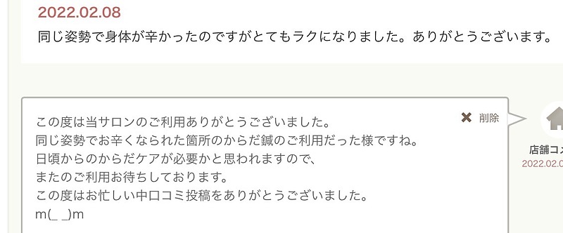 riri さん (女性|30代)52022.02.08 同じ姿勢で身体が辛かったのですがとてもラクになりました。ありがとうございます。店舗コメント2022.02.08 21:43この度は当サロンのご利用ありがとうございました。同じ姿勢でお辛くなられた箇所のからだ鍼のご利用だった様ですね。日頃からのからだケアが必要かと思われますので、またのご利用お待ちしております。この度はお忙しい中口コミ投稿をありがとうございました。