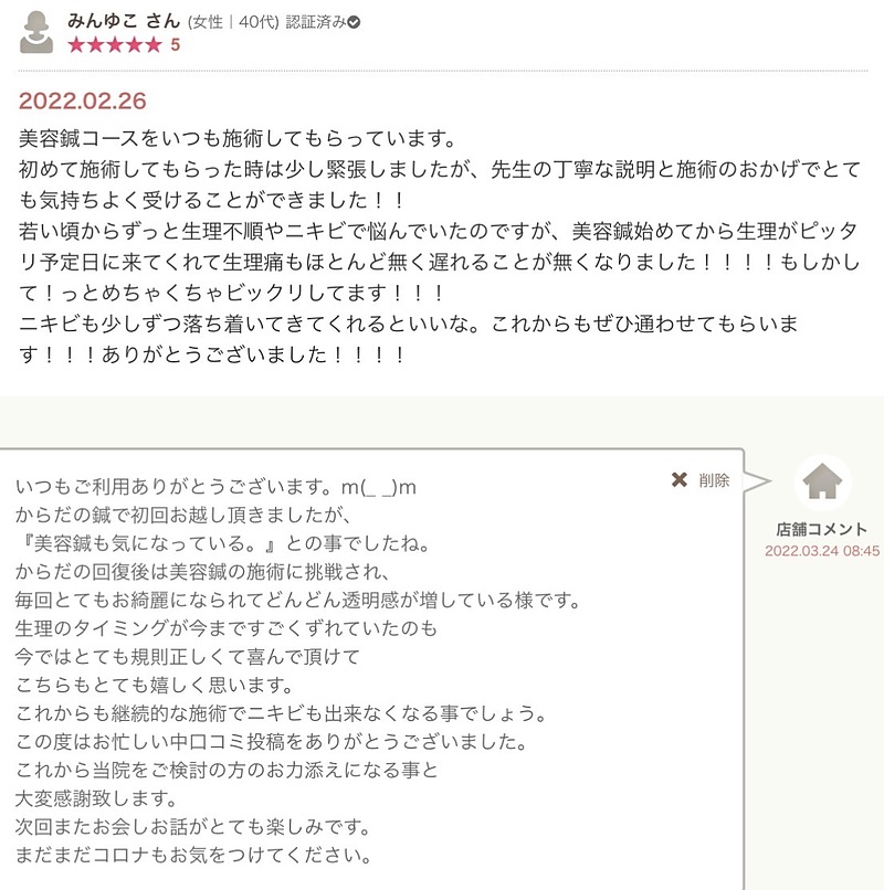 星 5美容鍼コースをいつも施術してもらっています。初めて施術してもらった時は少し緊張しましたが、先生の丁寧な説明と施術のおかげでとても気持ちよく受けることができました!!若い頃からずっと生理不順やニキビで悩んでいたのですが、美容鍼始めてから生理がピッタリ予定日に来てくれて生理痛もほとんど無く遅れることが無くなりました!!!!もしかして!っとめちゃくちゃビックリしてます!!!ニキビも少しずつ落ち着いてきてくれるといいな。これからもぜひ通わせてもらいます!!!ありがとうございました!!!!店舗コメント2022.03.24 08:45いつもご利用ありがとうございます。m(_ _)mからだの鍼で初回お越し頂きましたが、『美容鍼も気になっている。』との事でしたね。からだの回復後は美容鍼の施術に挑戦され、毎回とてもお綺麗になられてどんどん透明感が増している様です。生理のタイミングが今まですごくずれていたのも今ではとても規則正しくて喜んで頂けてこちらもとても嬉しく思います。これからも継続的な施術でニキビも出来なくなる事でしょう。この度はお忙しい中口コミ投稿をありがとうございました。これから当院をご検討の方のお力添えになる事と大変感謝致します。次回またお会しお話がとても楽しみです。まだまだコロナもお気をつけてください。