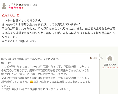 ニキビが気になって当サロンをご利用頂いたとの事、毎回お綺麗になりこちらも安心しております。皮膚科での塗り薬もあまり効果がなかったというご様子でしたが、毎回小さくなっている様で良かったです。