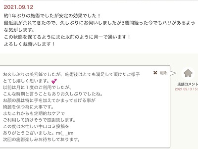 最近肌が荒れてきたので、久しぶりにお伺いしましたが3週間経った今でもハリがあるような気がします。