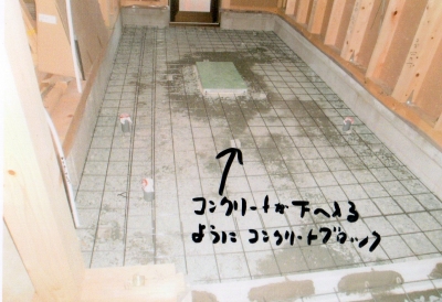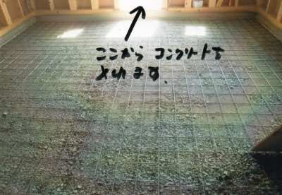 上の写真は厨房の土間です。メッシュの下にコンクリートが入るようにブロックをところどころに入れています。