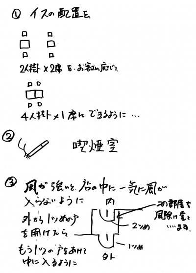 客席の方は比較的早くできたのですが、風除け室と階段、カウンターと厨房のスペースには悩みました。