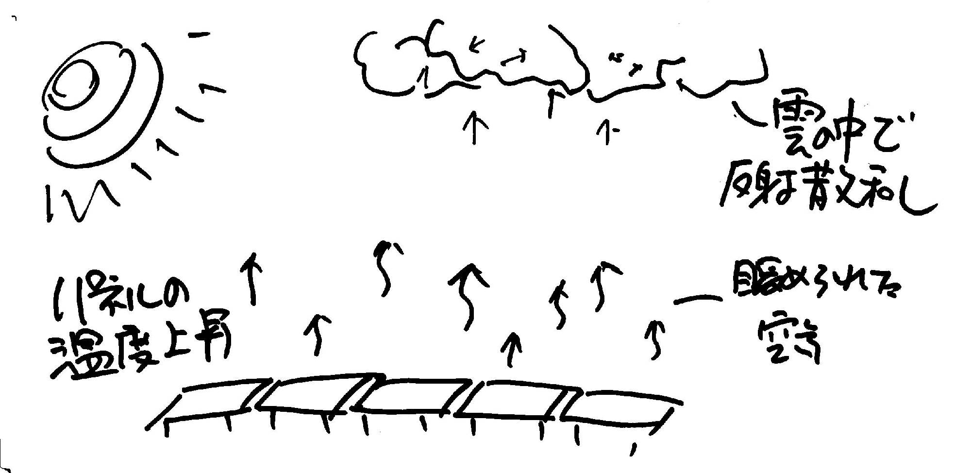そして、上空に雲があるとパネルから放射されたエネルギーは雲の中で散乱、反射され大気中に滞留し、その結果気温が上昇することになると書かれています。