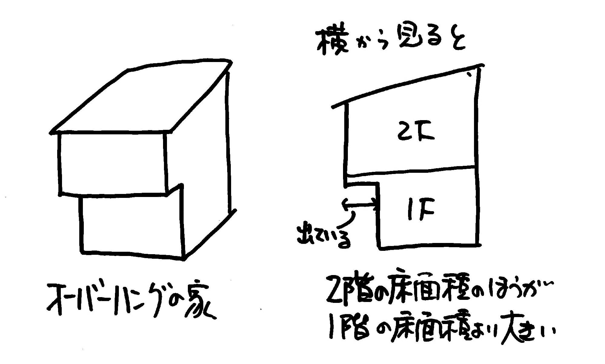 オーバーハングとは下の絵のように2階建ての場合、1階よりも2階が出ている住宅のことです。