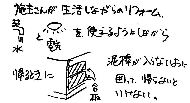 この経験談では、施主さんは住んだまま工事しましたから、水道や電気も一時止めたりしますが、生活に困らないように生かし、毎日の工事後は泥棒が入られないように合板などで囲ったりしないといけません。例えば、朝の洗濯が終わってから水を止め、昼食の前には必ず生かすなど、電気も何回も止めたり通電したりして大変な手間なのです。