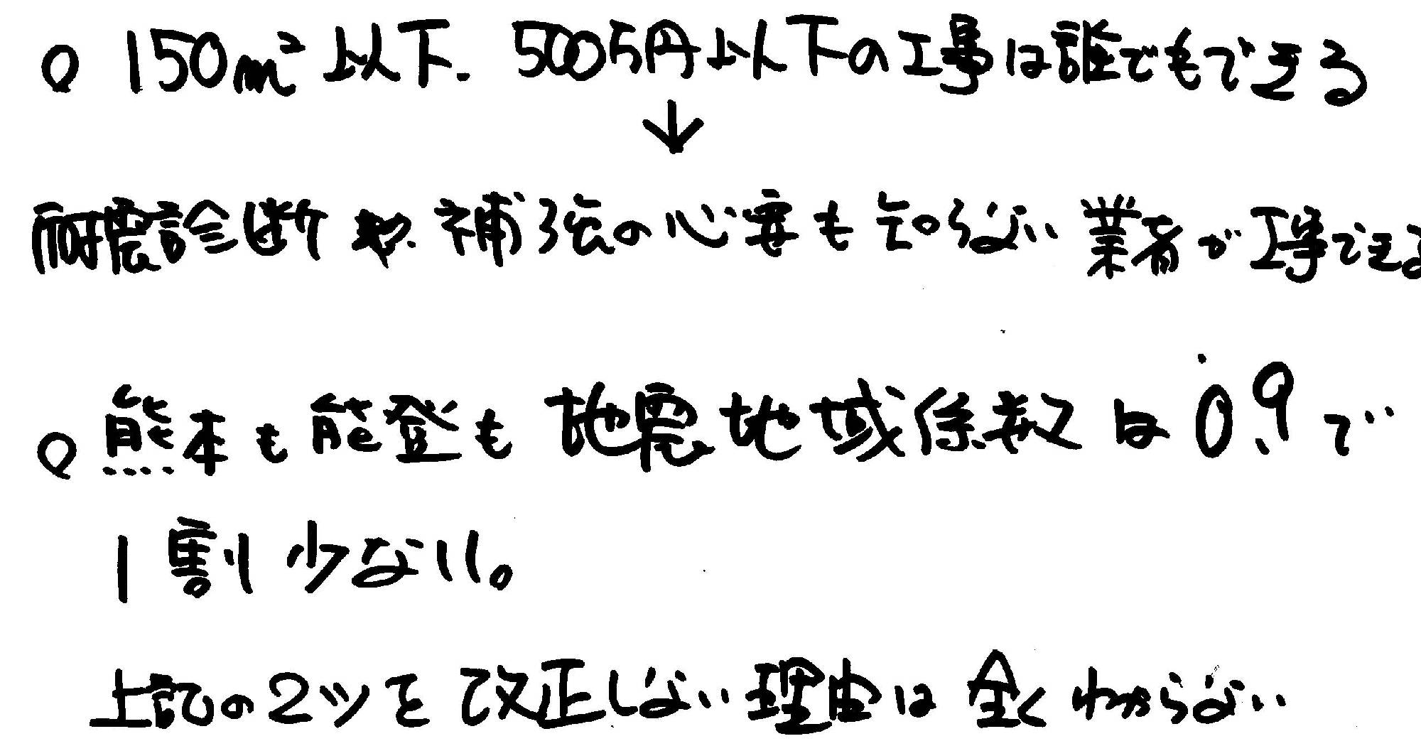 コラム「熊本地震で起きたこと分かったこと⑧」に書いた地震地域係数の見直しもありませんでした。昨年、大きな地震があった能登も熊本と同じ地震地域係数は0.9で1割低くなっています。なぜ、改正しないのかわかりません。