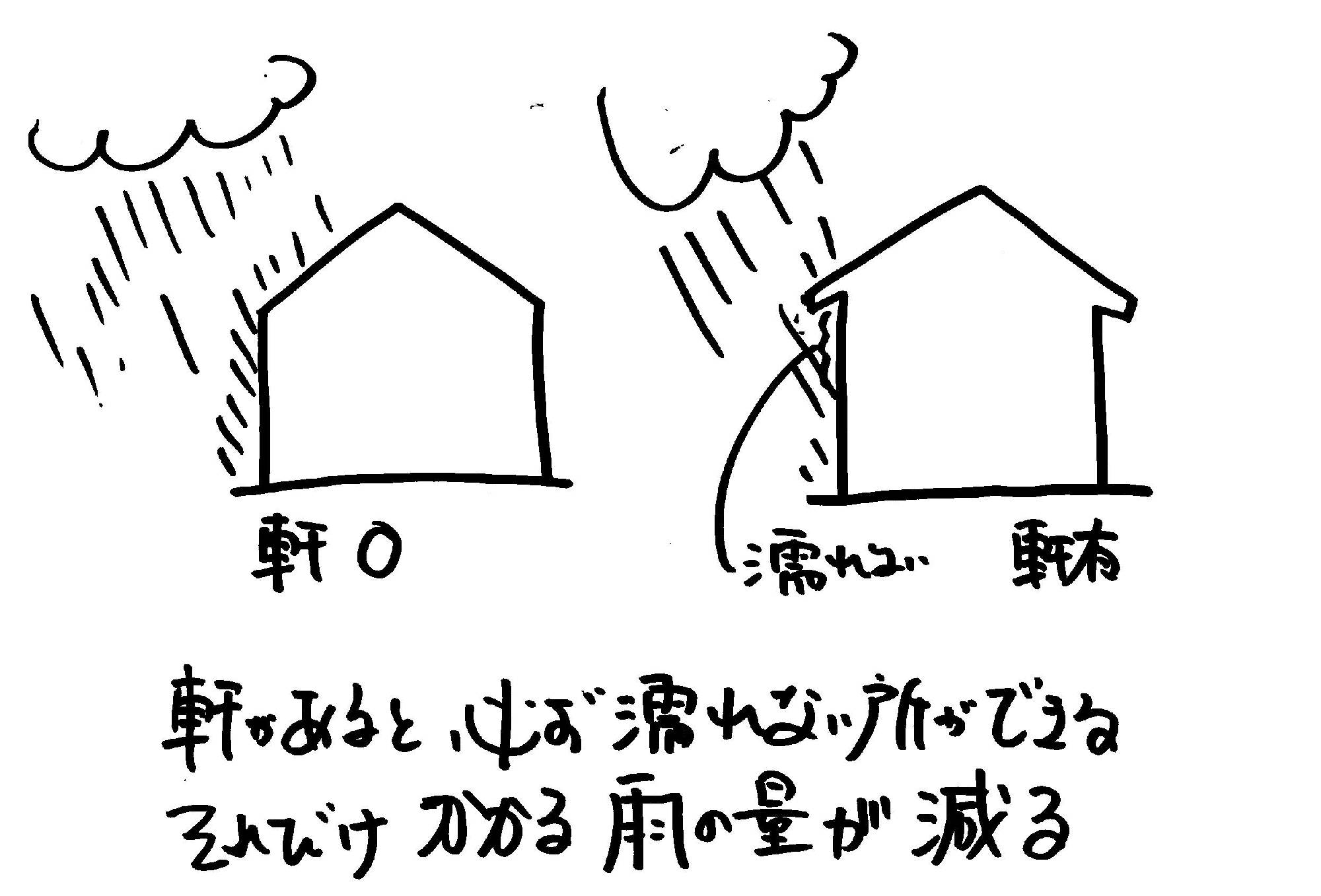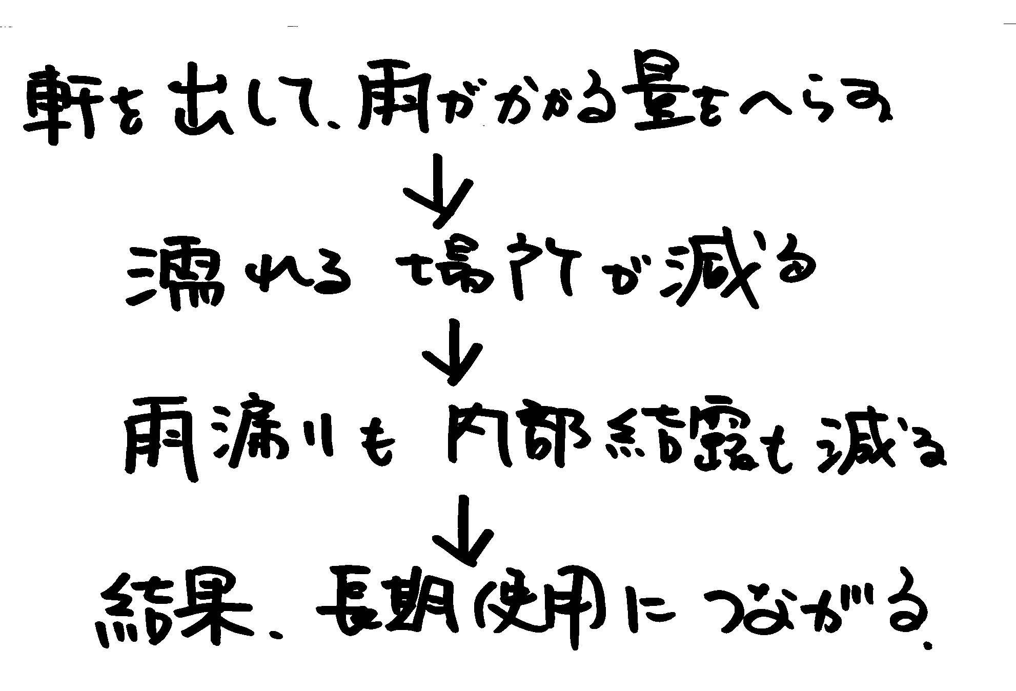 近年、建築の防水技術や材料は進みました。だから軒0の家でも雨漏りしないのですが、高気密高断熱住宅では、密閉されているためかわずかな雨漏りも夏型結露の原因になるようです。軒を出し、大きな窓には庇をつけて雨の影響を減らすことを見直すべきだと思います。