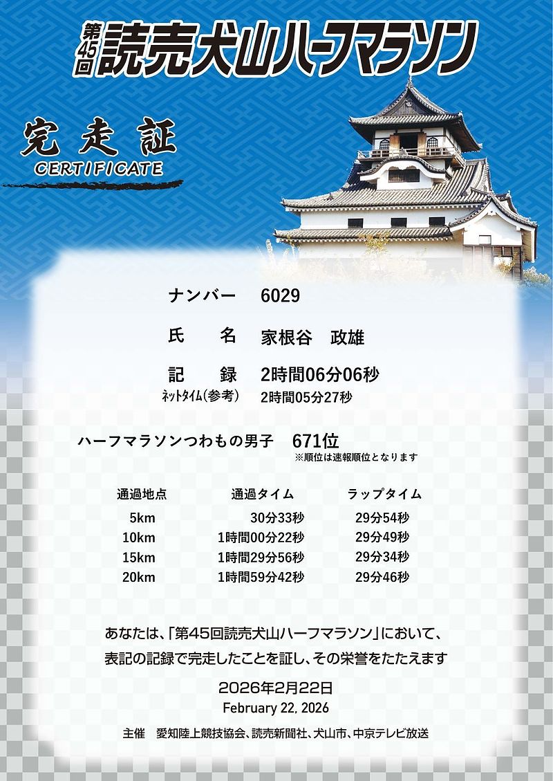 翌日(23日)ネットで「完走証」をプリントアウトしたところ、