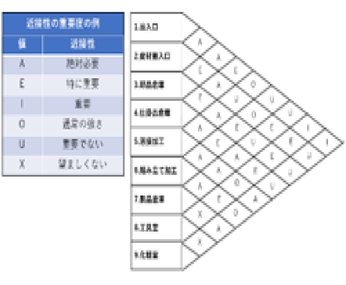 この図表を用いることで、どのアクティビティが近接して配置されるべきかを視覚的に把握することができ、また、効率的なレイアウト設計が可能となり、生産性の向上や作業効率の改善が期待できます。