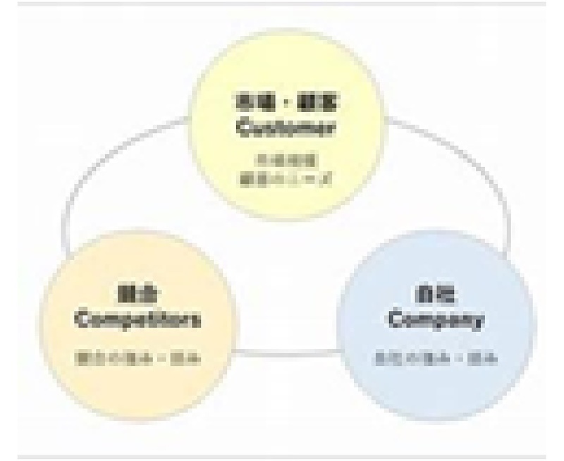 3Cとは、市場・顧客 (Customer)、競合 (Competitor)、自社 (Company) のそれぞれの英語の頭文字であり、そこから、3C分析と名付けられています。