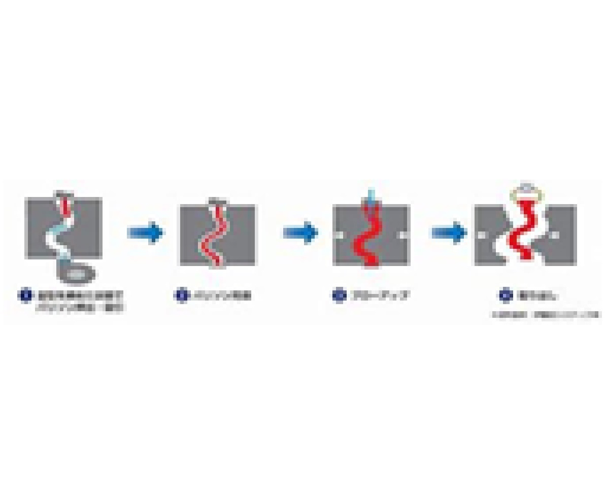 サクションブロー成形(Suction Blow Molding)とは、ブロー成形加工法の1つで、中空パイプのような中空部品の成形時に用いられる成形手法です。 細径~太径で長尺な3次元形状の中空パイプを、耐久性・均肉性高く成形加工することができます。
