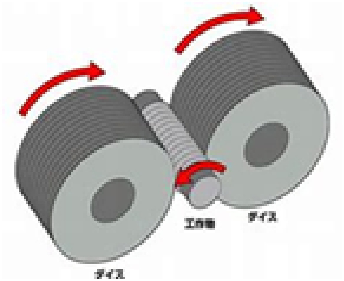 転造加工の加工手順としては、素材(棒材)を転造ダイスにより挟み込み、素材を回転させながら、素材の中心方向へダイスに圧力を加え、素材の降伏点を超えた圧力をかけることにより、素材は塑性され永久的に変形し、形状を造ります。このようにして成形されたねじを転造ねじといいます。加工後の素材の表面形状はダイスの表面形状に依存し、素材はダイスとは逆回転しながら加工部分が移動していくため、転造は逐次成形加工に分類されます。