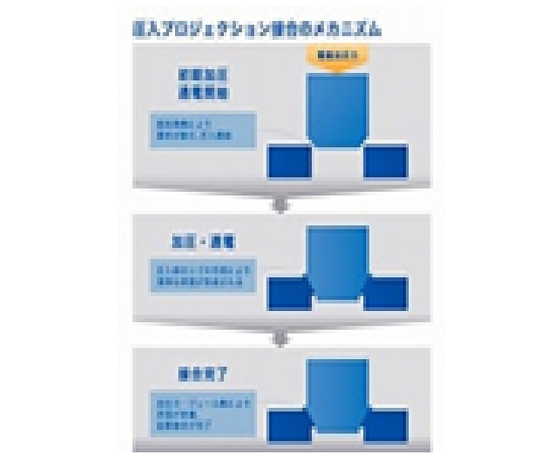 圧入プロジェクション接合は加工対象部材に圧力を加えて、電極で通電して圧力と抵抗発熱で部品同士を密着させる技術(固相拡散接合と呼ばれる)であり、接合部分の強度が高く、自動車部品の高機能・高品質化と低コスト化が可能となっています。
