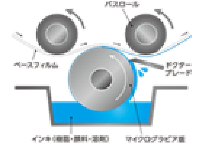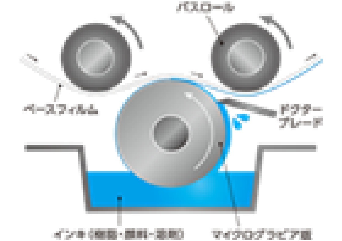 ドライラミネーションは、基材表面に有機溶剤で溶解した接着剤を塗布した後、乾燥装置内で溶剤を蒸発させ、第2基材と熱圧着する方法ですが、この接着剤の膜厚を適正にコントロールするのがグラビアコートであり、ときには、数~数十ミクロンという膜厚の制御を行う必要のある場合はマイクログラビア方式を採用しています。
