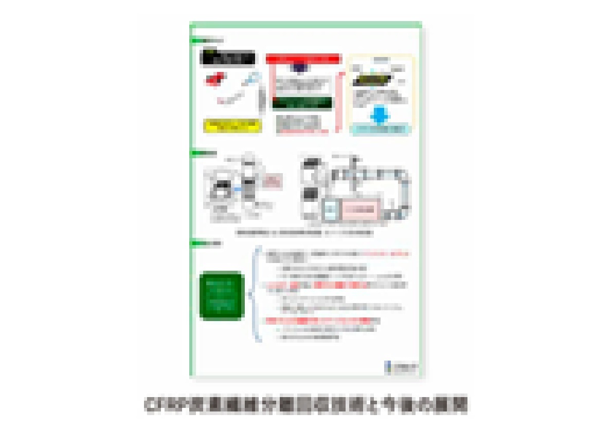 同大学出展内容は、CFRPを構成する炭素繊維を誘電加熱により選択的に加熱し直接エネルギーを注入することで炭素繊維のみを発熱させ繊維を覆う樹脂を熱分解し炭素繊維を回収するという画期的な技術の紹介です。CFRP(炭素繊維強化プラスチック)のリサイクル対応として、必見の内容です。