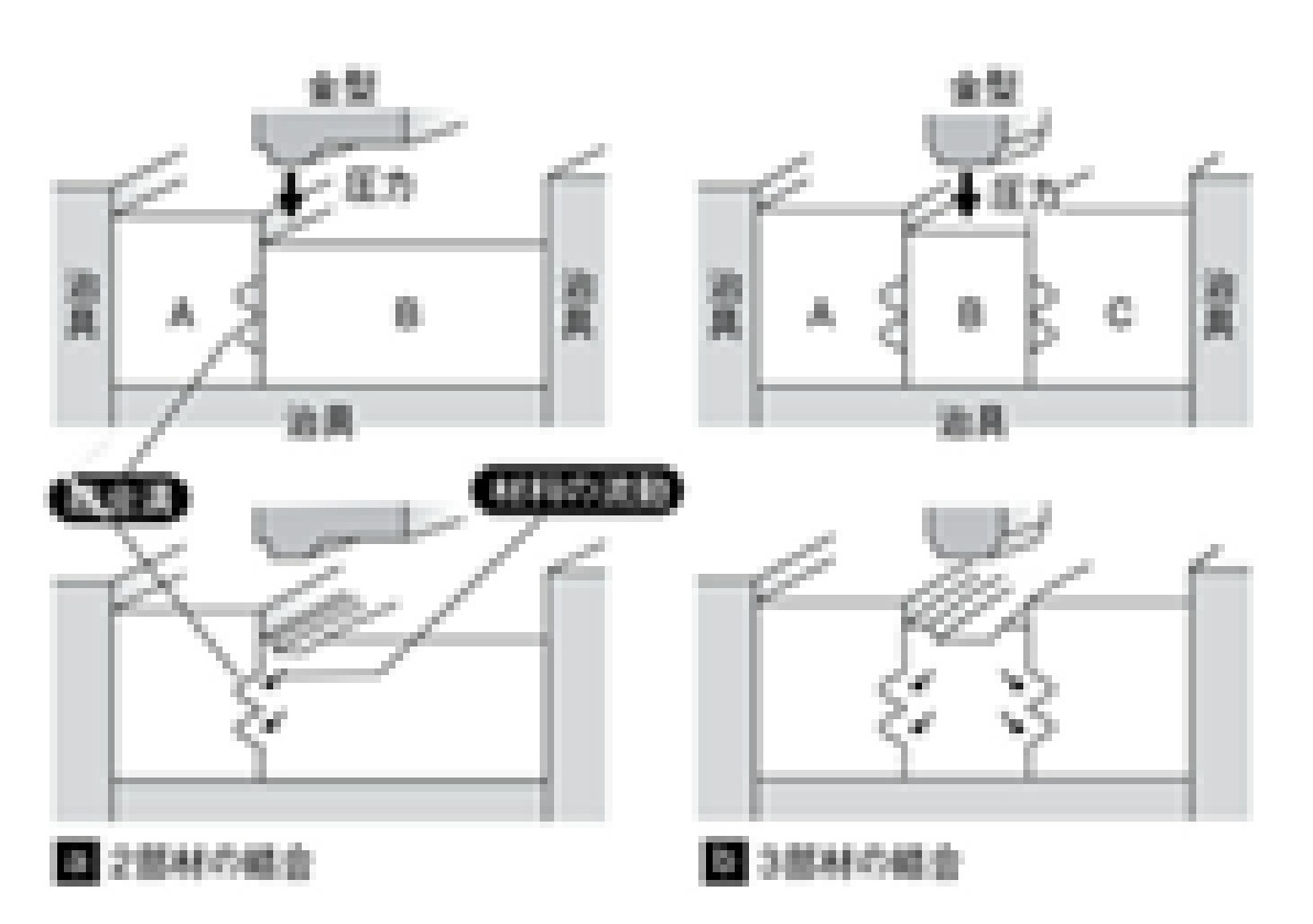 基本原理としては、結合する部材を治具にセットした後、軟質側の部材の一部を加圧して硬質側部材の溝に塑性流動させ、機械的なかみ合いを得て結合させるというのもです。