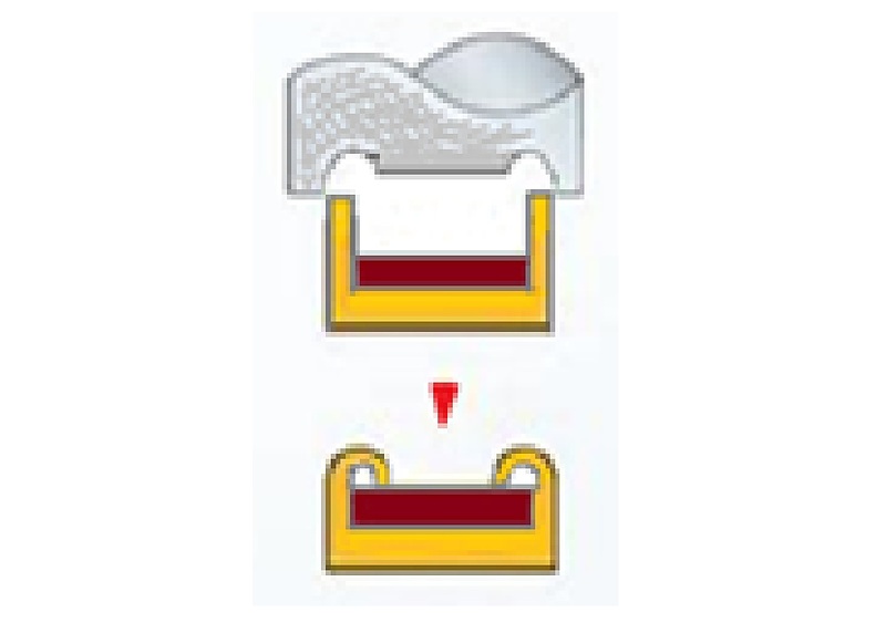 巻鉸めは、鉸め加工の一種であり、巻き鉸めパンチにより、外周につばを持つ製品(部品)を内側に丸く塑性変形させておこなう鉸めです。鉸め形状は円形(上から見てドーナツリング状)で整った形をしており、外観的に見栄えが良いのが特長です。特に全周均一な鉸めは「全周巻き鉸め」と称されることもあります。この鉸めによる固定は多くの場合、保持力を期待するというより、抜け止めとしての冗長的な意味合いが強いのが一般です。