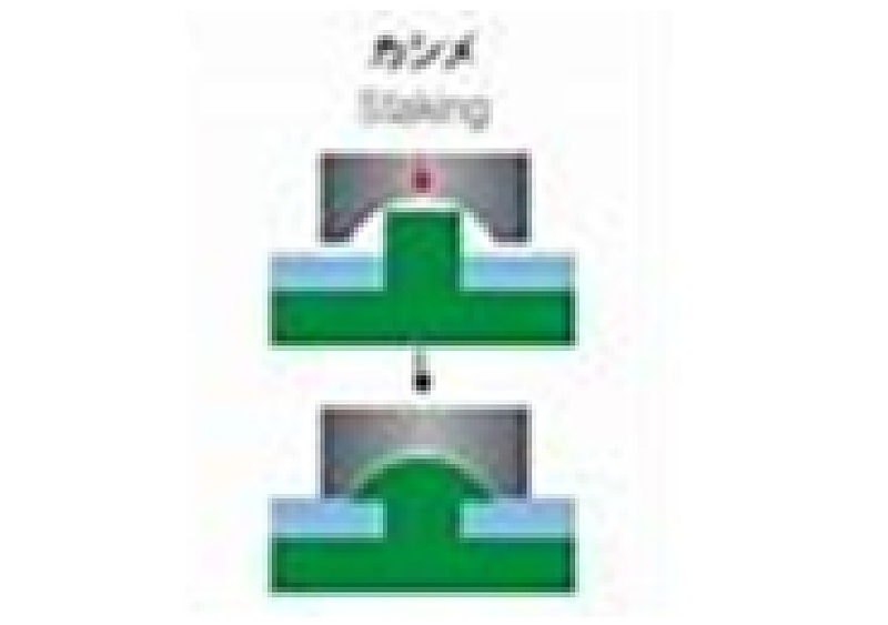 超音波鉸めは、超音波溶着と異なり(超音波溶着は樹脂どうしの圧接部分で溶着させることを目的に超音波振動を与えるため、振動伝達部は樹脂に変形を与えないよう極力フラットにしておく)、超音波振動するホーンの先端(鉸め形状に合わせた様々な形)にて直接樹脂を熱変形させることにより、もう一方の部品の固定化をはかるものです。(リベットタイプの鉸め形状が主流)