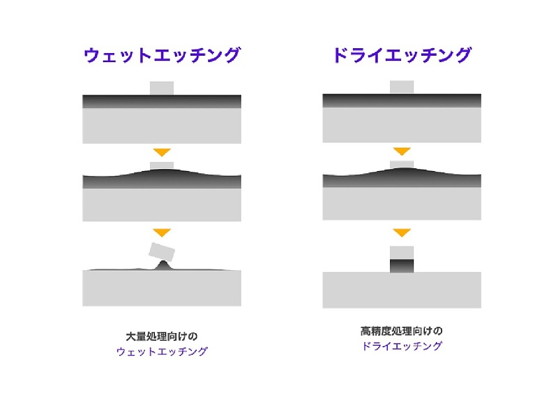 金属のエッチング加工としては、溶液を用いた金属の溶解現象を利用して不要な金属部分の除去加工をおこなうウェットエッチングが一般的です。
