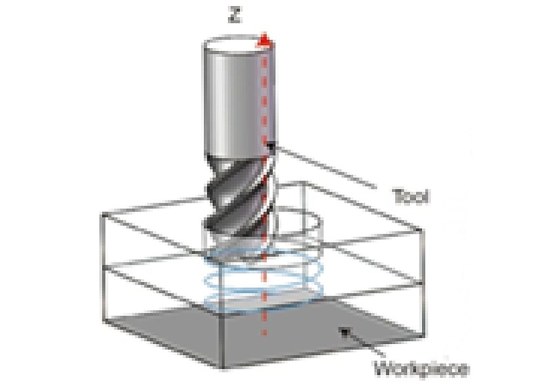 マシニングセンタの〈ヘリカル補間機能〉を用いてエンドミルをらせん状に動かすことで実現し、工具への負担を分散させ、比較的安定した仕上がりが得られる加工法です。