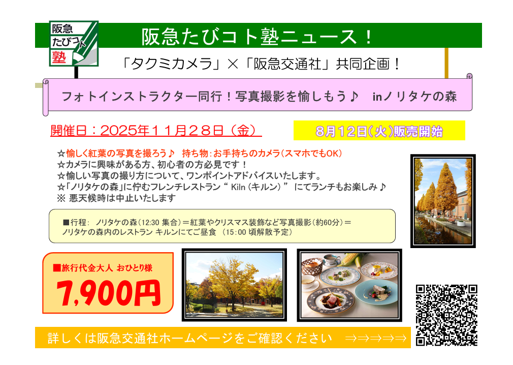 11/28(金)「阪急交通社」×「タクミカメラ」のコラボ企画~タクミカメラ店主のスーさんとご一緒に秋の紅葉撮影とフレンチレストランでランチを愉しもう~