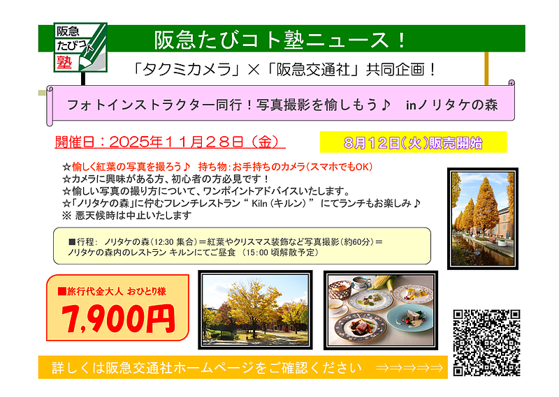11/28(金)「阪急交通社」×「タクミカメラ」のコラボ企画~タクミカメラ店主のスーさんとご一緒に秋の紅葉撮影とフレンチレストランでランチを愉しもう~