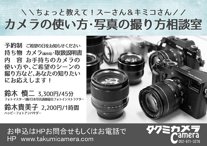 ちょっといいカメラ買ったけど、ダイヤル多すぎてよく分からずにずっとプログラムオートで撮ってますという方、ご主人さまのカメラを借りたけど、使い方が分からないという方、お手持ちのカメラの使い方や、ご希望のシーンの撮り方など、あなたの知りたいにスーさん&キミコがお応えします!