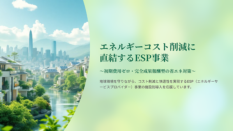 ESP(エネルギーサービスプロバイダー)事業は、初期費用ゼロかつ成果報酬型の画期的な省エネソリューションです。無料の省エネ診断から始まり、詳細調査と最適提案、導入後の成果で報酬をいただく安心設計です。最新技術と独自のノウハウを駆使し、快適性を損なわずに「ガマンしない省エネ」を実現。産学官連携による信頼の体制も強みとなっており、工場・商業施設・医療機関・教育機関など幅広い現場で経費削減とCO₂排出削減を同時に達成します。環境配慮とコスト削減の両立を目指す企業・施設に、最適な省エネ導入を支援します。初期導入コストゼロ!エネルギーコストを削減したい方におすすめ