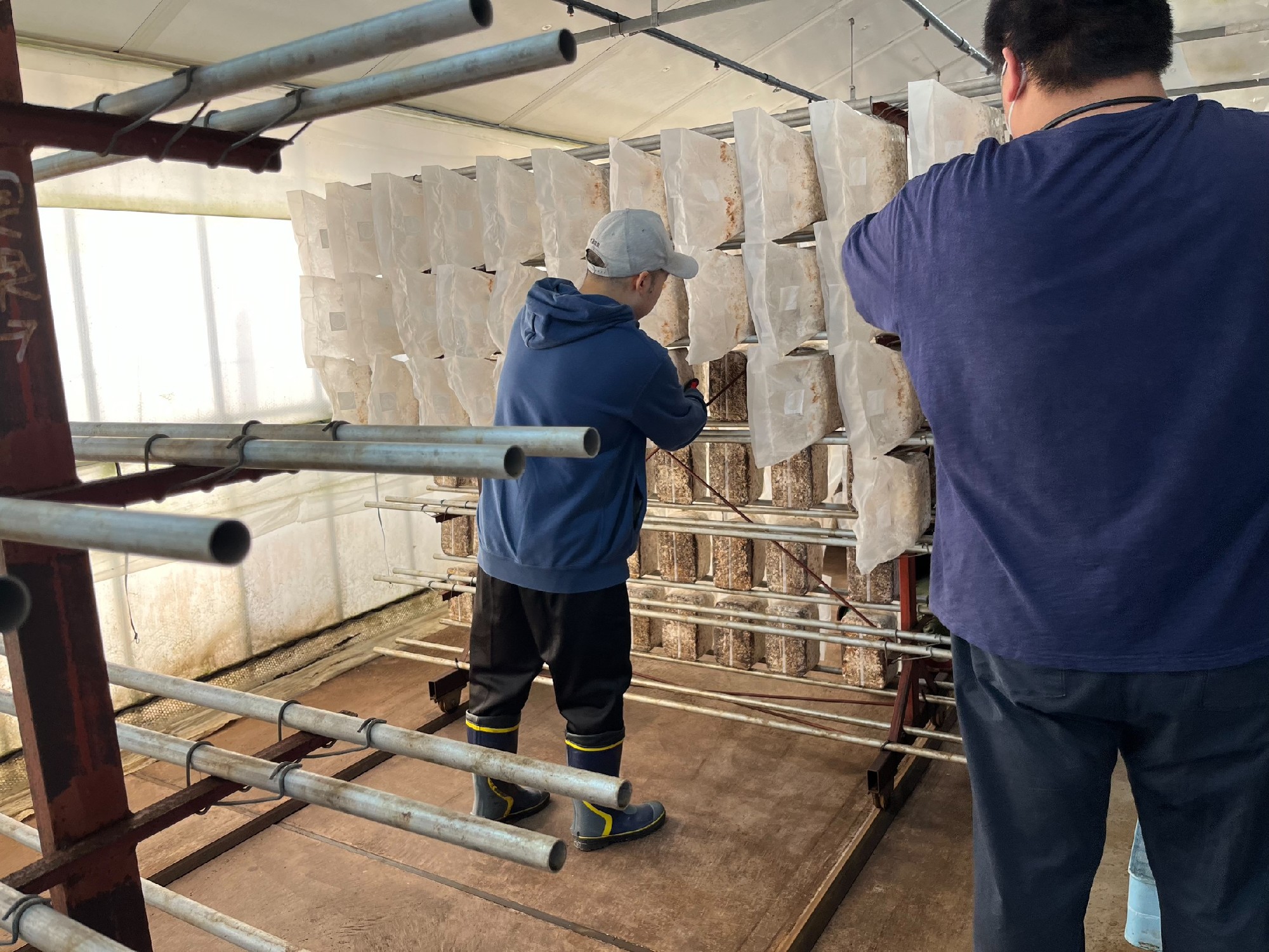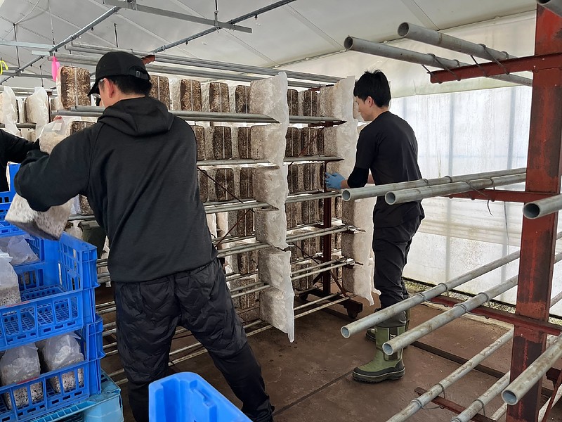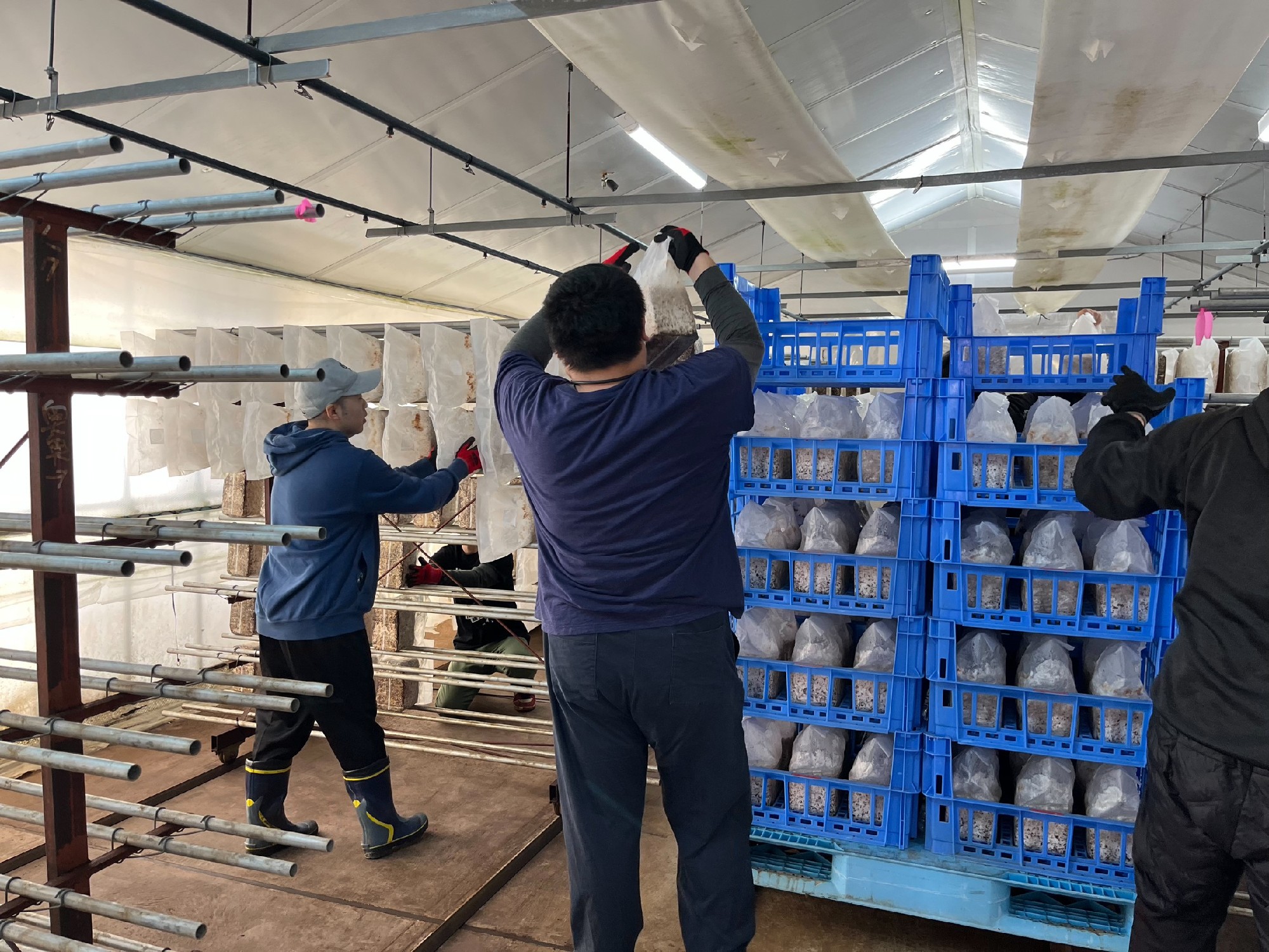 入れ替え作業は、スタッフみんなで協力して行います。重さのある菌床を一つひとつ丁寧に運び出し、新しい菌床を並べていく作業は大変ですが、とても大切な工程です。