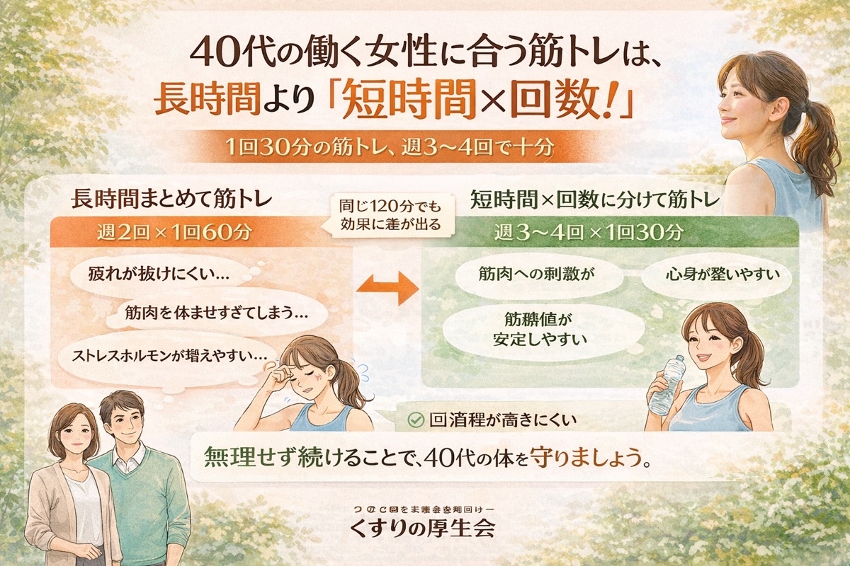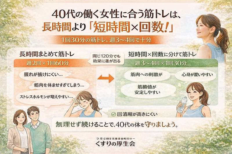 むしろ、1回30分程度の筋トレを週3〜4回に分けた方が、体にやさしく、続けやすい方法です。