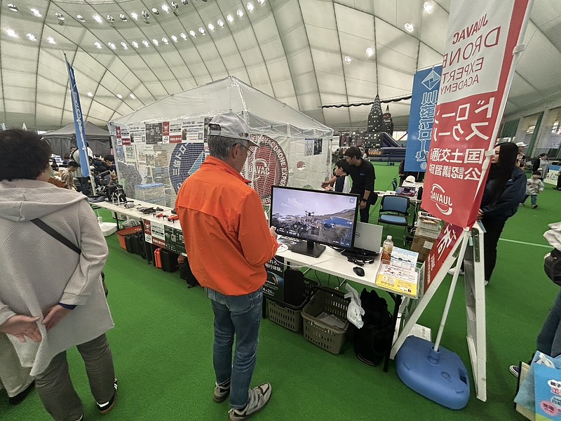 会場のしもきた克雪ドームでは、ステージイベントや自衛隊展示、働く自動車の体験コーナー、地元グルメのブースなどが並び、多くの来場者で賑わいました。その中で私たちは、空撮や点検、教育など多様な用途のドローンを展示。さらに水中ドローンも披露し、「初めて見た」「水の中でも撮影できるんですね」と驚きの声が上がりました。