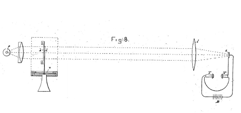特許第125946号の明細書には、レンズで平行にした光を、内面の反射率が良好な金属導管又は水晶棒を「光線の導管」に用いて通過させることが記載され、ベルの1880年の光線電話の発明の技術的課題を解決した偉人と言える。