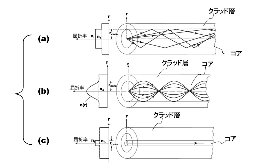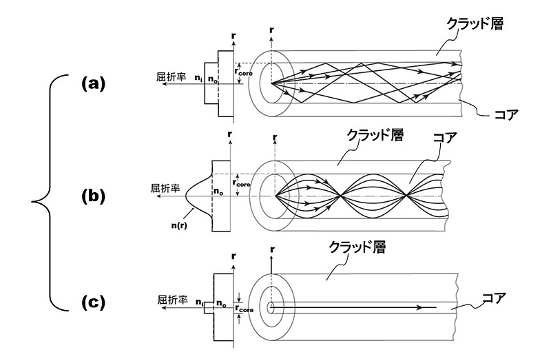 図2(a)に示すSI型多モードファイバではコア内の光はクラッド層で反射されながら進む。コアへの光の入射角度が異なると光の進み方が変わる。高角で入射した光は低角で入射した光より同じファイバ長を進むのに反射回数が多いため多く時間がかかる。その結果、パルス信号光を入射した場合、光が進むにつれパルス幅が広がり前後のパルスが重なってしまうので通信に使われることはない。一方、コア径を大きくできるので光のパワーを伝送する用途に使われる。